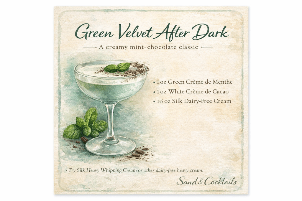 There’s something undeniably nostalgic about a Grasshopper — minty, creamy, and just indulgent enough to feel like a treat. Green Velvet After Dark keeps that familiar comfort but softens it into something more refined. Cool mint leads the sip, followed by a gentle wash of chocolate that never overwhelms, finishing smooth and velvety thanks to a dairy-free cream that surprises in the best way. It’s rich without being heavy, nostalgic without feeling dated — the kind of cocktail meant for late evenings when dessert feels optional and the night doesn’t need to end just yet.